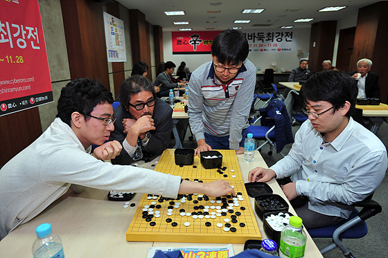 ▲ 신민준 6단이 오늘 3시 40분 기차를 타고 서울로 돌아가면서 한산해진 검토실. 목진석 국가대표 감독과 일본 선수단만 검토를 하고 있다. 왼쪽부터 이치리키 료 8단, 조치훈 일본 단장, 목진석 국가대표 감독, 야마시타 게이고 9단.