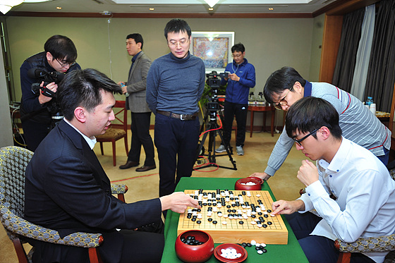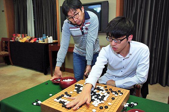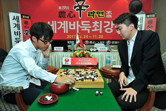 ▲ 알파고 제로의 붙임수를 구사하는 김명훈 5단(왼쪽). 농심신라면배 첫 출전한 김명훈 5단이 당이페이 9단의 연승을 저지하고 첫 승리를 거둘 수 있을지 관심이 모인다.