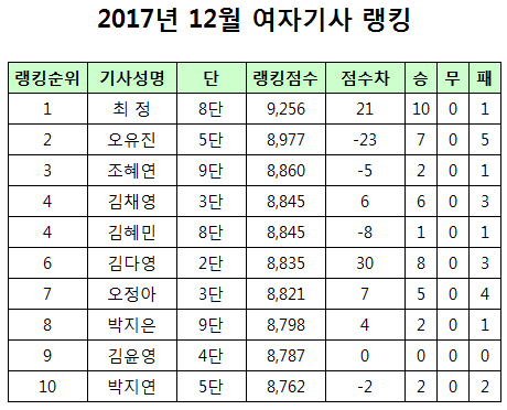 100위권 내에서는 퓨처스리거로 KB리그 포스트시즌에서 맹활약을 펼친 홍기표 8단이 9계단 오른 44위로 가장 큰 폭의 랭킹 상승을 기록했다. 22위에 오른 강승민 5단은 KB리그 포스트시즌과 크라운해태배를 통해 8승 2패를 기록하며 가장 많은 점수를 얻었다.