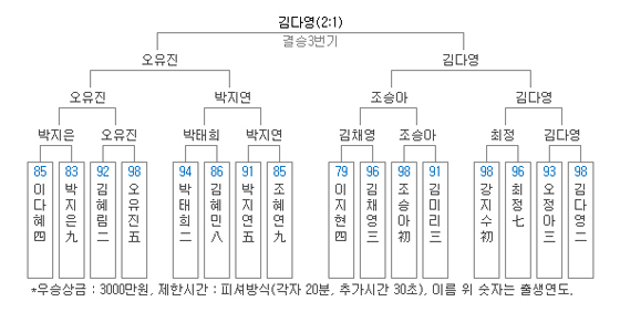 한편 준우승한 오유진 5단은 김혜림 2단, 박지은 9단, 박지연 5단을 연파하며 결승에 올랐지만 98년 동갑내기 김다영 2단에게 역전패하며 우승컵 획득을 다음으로 미루게 됐다.