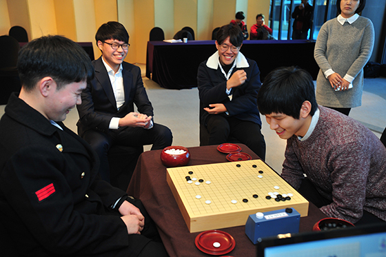 ▲ 릴레이 바둑은 대국 내내 웃음이 끊이지 않았다.(왼쪽부터) 이호범 6단, 송지훈 3단, 홍무진 3단, 이지현 6단