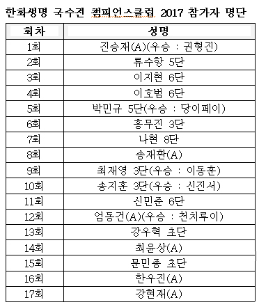 역대 우승자 16명과 올해 17회 우승자가 참가한 한화생명 국수전 챔피언스클럽 2017은 단체전과 릴레이 바둑, 신입 신고 이벤트 등의 프로그램으로 7시간 동안 열렸다. 이번 대회는 우승자 우선 참가가 원칙이지만 부득이하게 참가가 어려운 경우 준우승자가 대체 출전했다.