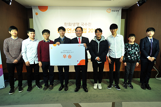 ▲ 우승 한화팀.(왼쪽부터) 이지현 6단, 엄동건, 신민준 6단, 진승재, 홍정표 한화생명 실장, 홍무진 3단, 강우혁 초단, 한우진, 최재영 3단