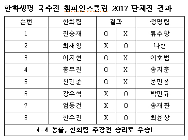 본격적인 대회에 앞서 열린 추첨식에서 1회 준우승자 진승재와 2회 우승자 류수항 5단이 주장을 맡아 ‘한화팀’과 ‘생명팀’으로 각각 8명씩 팀을 구성했다.