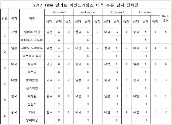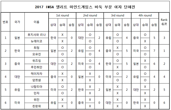 한국이 2017 IMSA 엘리트 마인드 게임스 바둑 부문 남녀 단체전에서 동반 우승을 차지했다.