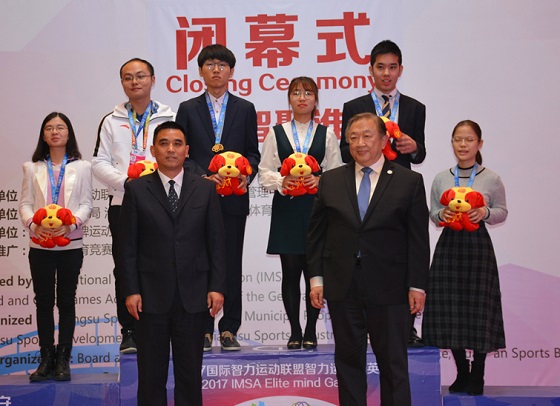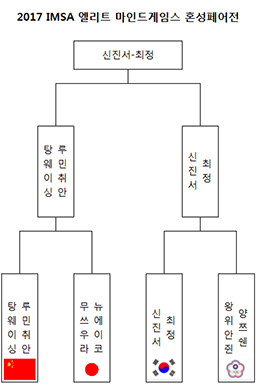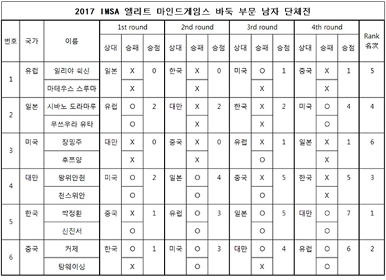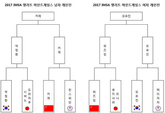 10일부터 15일까지 중국 장쑤(江蘇)성 화이안(淮安)에서 개최된 2017 IMSA 엘리트 마인드 게임스 바둑 부문에서 한국은 남녀 단체전에서 동반 우승한데 이어 여자 개인전과 혼성 페어전에서 금메달을 추가해 금메달 4개, 은메달 1개로 종합우승을 달성했다.