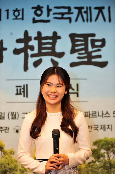 이어 단상에 오른 이복진 한국제지 대표이사는 “멋진 경기를 보여준 선수들과 바둑팬들의 관심 및 사랑으로 대회가 성공적으로 마무리 돼 기쁘다”면서 “첫 대회라 부족한 점이 많았지만 계속 발전해 나가는 ‘한국제지 여자기성전’이 될 것을 약속하며 내년에도 바둑과의 행복한 만남을 이어 갈 수 있게 되길 기대한다”고 화답했다.