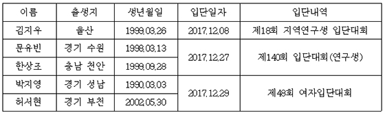면장을 받은 입단자들의 약력은 다음과 같다.