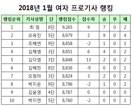 2018년 1월 프로기사 랭킹 보기(클릭)