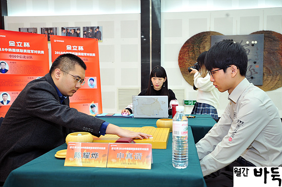 20일 오후 12시 30분(한국시간 오후 1시 30분) 중국 베이징 중국기원 2층 대회장에서 2018 진리배 한중 바둑리그 우승팀 대항전 2차전이 시작됐다. 대진은 이창호 9단vs 퉈자시 9단(속기 대국), 신진서 8단vs 천야오예 9단(주장전), 김명훈 6단vs 이링타오 4단, 한승주 4단vs 한이저우 5단(앞 쪽이 정관장 황진단).