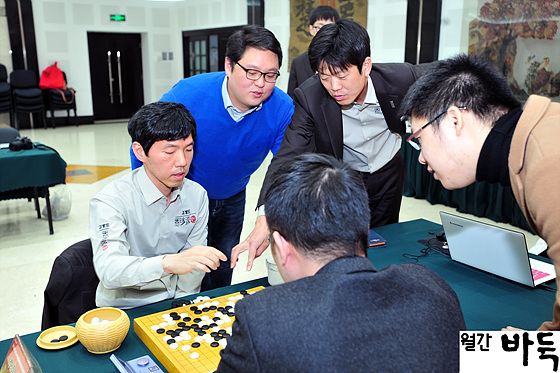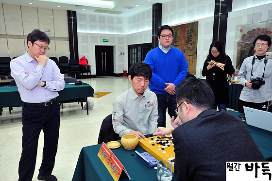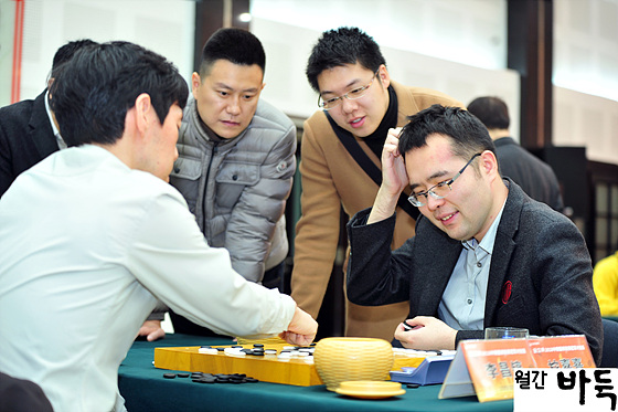▲ 이창호 9단의 동생 이영호 씨와 정관장 황진단의 김영삼 감독이 국후복기에 합류했다. 중국어에 능통한 이영호 씨가 이창호 9단의 통역을 맡아 대국자 퉈자시 9단을 비롯한 중국 기사들과 소감을 나눴다.
