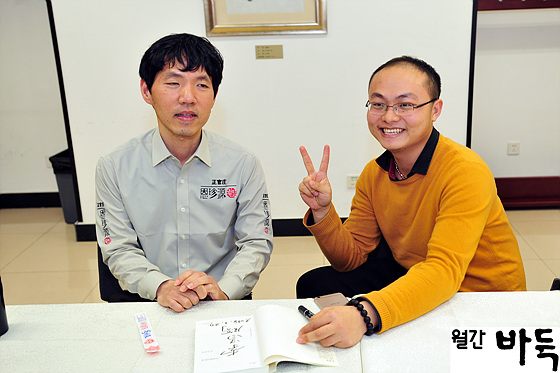 ▲ 마지막은 탕웨이싱 9단이 장식했다. 인터뷰가 끝나기만을 기다리던 탕웨이싱 9단은 곧바로 책을 내밀며 사인을 요청.