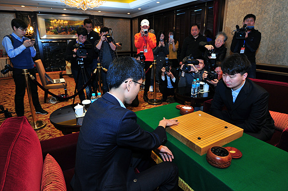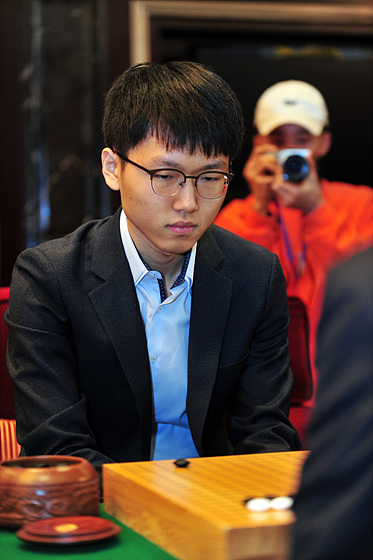 돌을 가린 결과 신진서 8단이 흑을 잡았다. 현재 우하귀에서 첫 번째 접전이 펼쳐지고 있다. 중국 상하이 현지 대국장 모습을 사진으로 전한다.