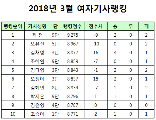한편 100위권 내에는 백찬희 3단이 일곱 계단 오른 83위로 가장 큰 상승폭을 보였고, 여자기사 중에는 최정 9단이 47위로 유일하게 100위권에 자리했다.