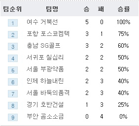 반면 첫 패배를 당한 포항 포스코켐텍을 비롯해, 2연승 후 3연패가 된 인제 하늘내린, 이길 때는 3:0 질 때는 1:2인 서귀포 칠십리, 2연승 후 2연패가 된 서울 부광약품 등 4팀이 울었다.