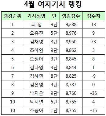 한편 4승 4패로 부진한 모습을 보이고 있는 신진서 8단은 한 계단 하락한 3위에 자리했고, 5승 4패를 기록한 이세돌 9단 역시 한 계단 하락해 4위로 내려갔다.