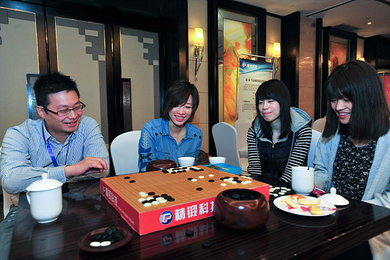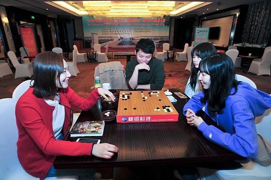 중국 장쑤성 장옌 호텔 3층에 마련된 검토실에는 국가대표 상비군 코치를 맡고 있는 홍민표 9단과 오유진 5단, 김미리·김다영 3단을 비롯한 한중일 출전 선수단이 열띤 검토를 하고 있다.