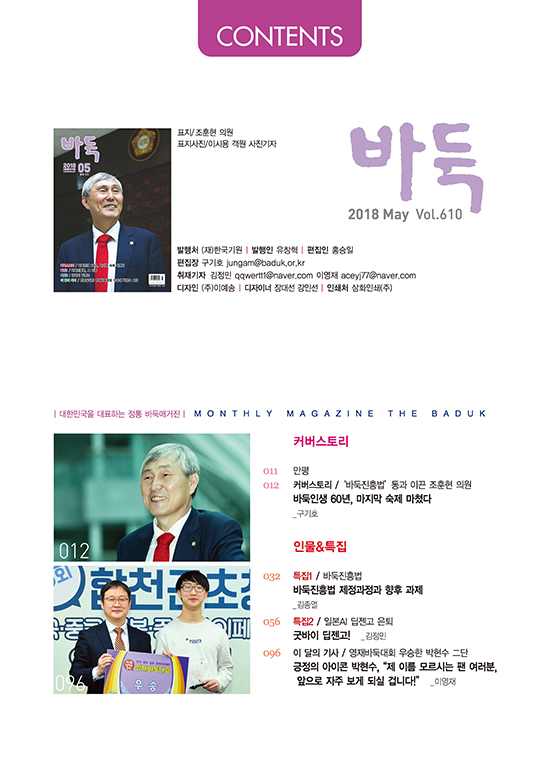 [커버스토리]에서는 바둑진흥법 통과를 이끈 조훈현 의원을 만나 바둑인생 60년의 마지막 숙제를 마친 소회를 들어봤다. [특집1/바둑진흥법]에서는 바둑진흥법 제정과정과 향후 과제를 조훈현 의원실 김종열 보좌관이 상세하게 풀어냈다.