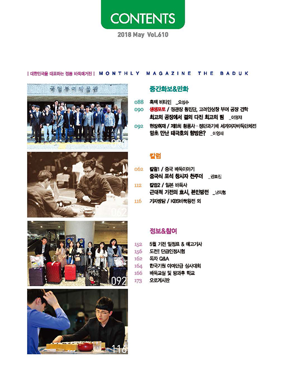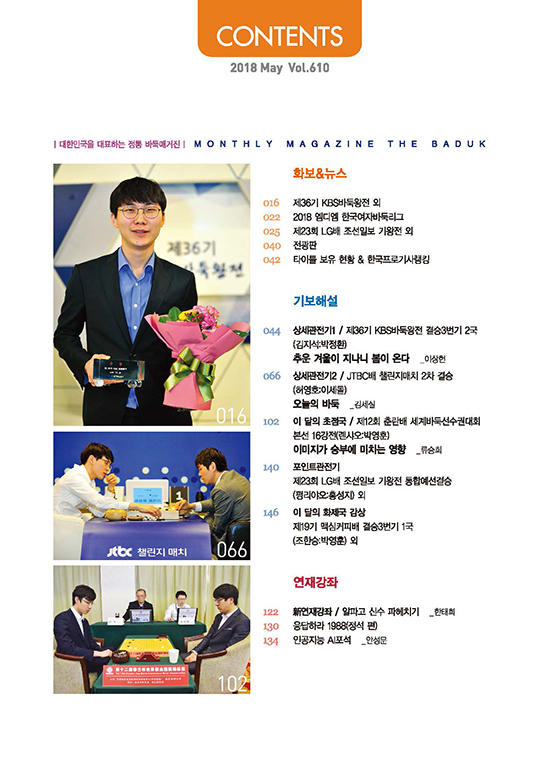 이밖에도 권효진의 [중국 바둑이야기], 남치형의 [일본 바둑사] 등 다채로운 칼럼과 연재강좌 [특강/알파고 신수 파헤치기], [사활의 원리], [응답하라 1988 정석편], [인공지능 AI포석] 등 알찬 강좌가 독자 여러분을 찾아간다.
