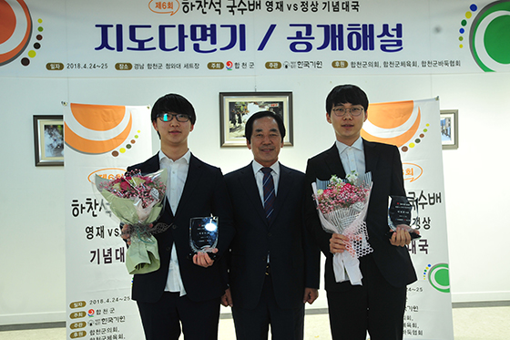 ▲대국 후 열린 시상식. (왼쪽부터) 박현수 2단, 하창환 합천군수, 박정환 9단