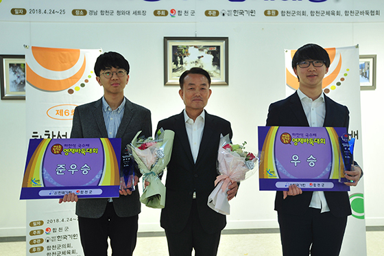 ▲ 6기 하찬석국수배 영재바둑대회 시상식도 함께 열렸다. (왼쪽부터) 준우승 박진영 2단, 전문환 합천군바둑협회장, 우승 박현수 2단