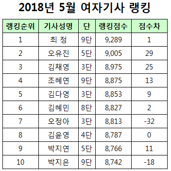 한편 100위권 내에는 김진휘 3단이 열 한 계단 오른 78위로 가장 큰 상승폭을 보였고, 박건호 3단이 45점으로 가장 많은 점수를 획득하며 65위에 올랐다.
