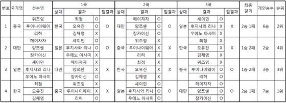 한편 1라운드에서 한국에게 승리를 거둔 중국은 2라운드에서 대만을 3-0으로 꺾었지만 3라운드에서 일본에 1-2 패하며 종합전적 2승 1패를 기록했다. 한국과 중국은 2승 1패로 동률을 이뤘지만 동률 시 개인승수의 합으로 순위를 결정하는 규정에 의해 개인승수 7승인 한국이 개인승수 6승인 중국을 꺾고 우승컵을 차지했다. 1승 2패로 동률을 기록한 일본과 대만은 개인승수에서 3승을 차지한 일본이 3위를, 2승을 기록한 대만이 4위를 차지했다.