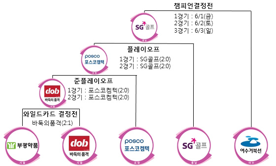 정규리그 2위 충남 SG골프와 3위 포항 포스코켐텍은 정규리그 전ㆍ후반기 두 차례 대결에서 SG골프가 모두 2-1로 승리한 데 이어 3판 2선승제의 플레이오프에서도 SG골프가 1, 2차전 모두 승리를 챙겼다.
