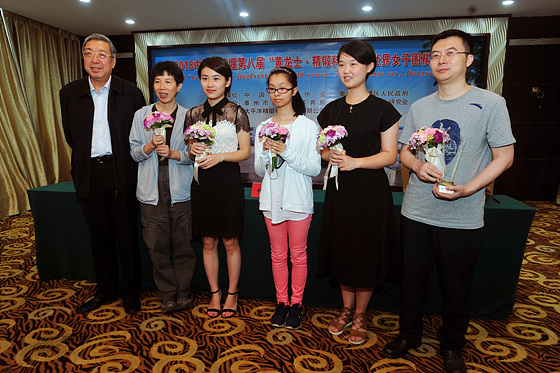 ▲ 우승을 차지한 중국 선수단. 왼쪽부터 링젠차오 중국 위기협회 주석, 루이나이웨이 9단, 위즈잉 6단, 저우홍위 3단, 왕천싱 5단, 왕레이 단장.