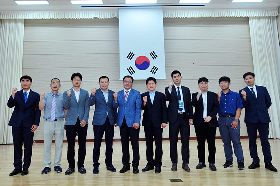 ▲ 내빈 단체사진. 왼쪽부터 김주호 9단, 전라남도청 박종열 스포츠산업과장, 양건 9단, 전라남도교육청 왕명석 과장, 이만구 전라남도바둑협회장, 한국바둑고등학교 박경희 교장, 한종진 9단, 김남훈 초단, 김지우 초단, 신철호 전라남도바둑협회 사무국장.