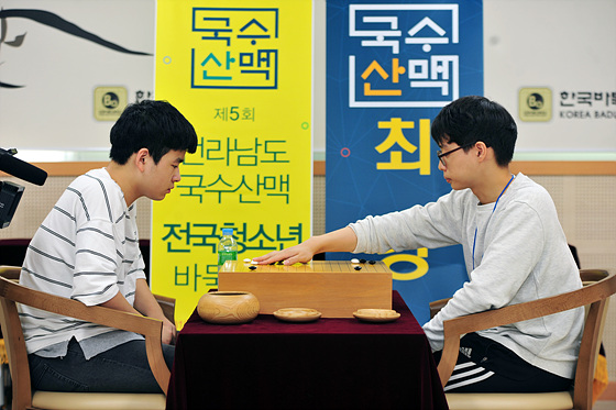 ▲ 제5회 전라남도 국수산맥 전국청소년 바둑축제 최강부 결승전. 엄동건(오른쪽)이 금지우에게 흑으로 1집반승을 거두며 우승을 차지했다.