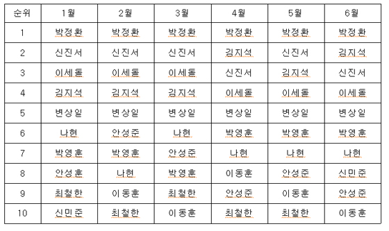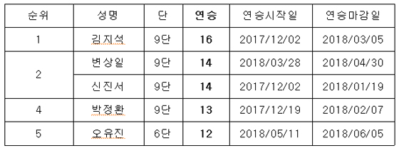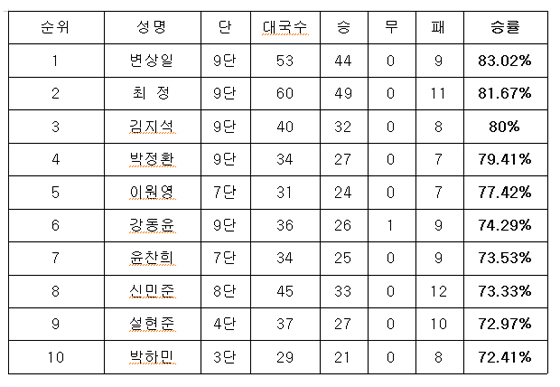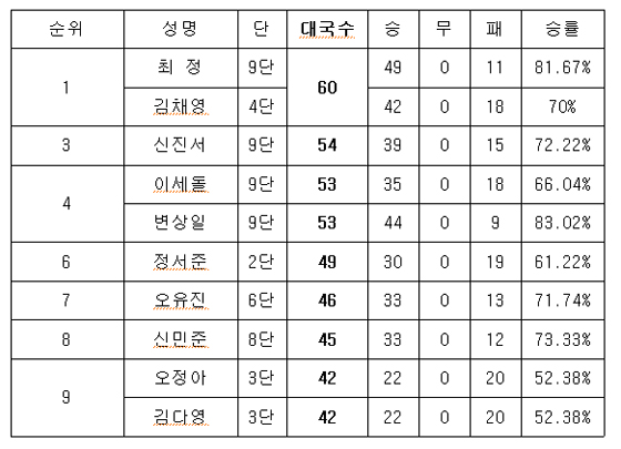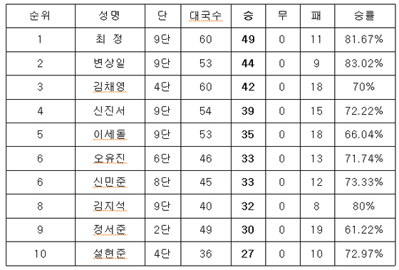 한편 상반기 랭킹 1위 자리를 지킨 박정환 9단은 2013년 12월 이후 55개월째 랭킹 1위 자리를 굳건히 지켰다.
