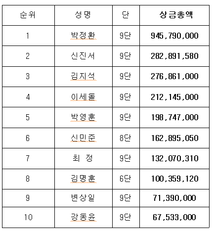 지난해 총 6억 7000만원의 수입을 올려 상금랭킹 1위에 오른 박정환 9단은 올해 상반기에만 9억 4500만원이 조금 넘는 수입을 올렸다. 상반기에만 지난해보다 2억 7000만원 넘는 소득을 올린 박9단은 올해 상금 10억원 돌파를 예약했다.