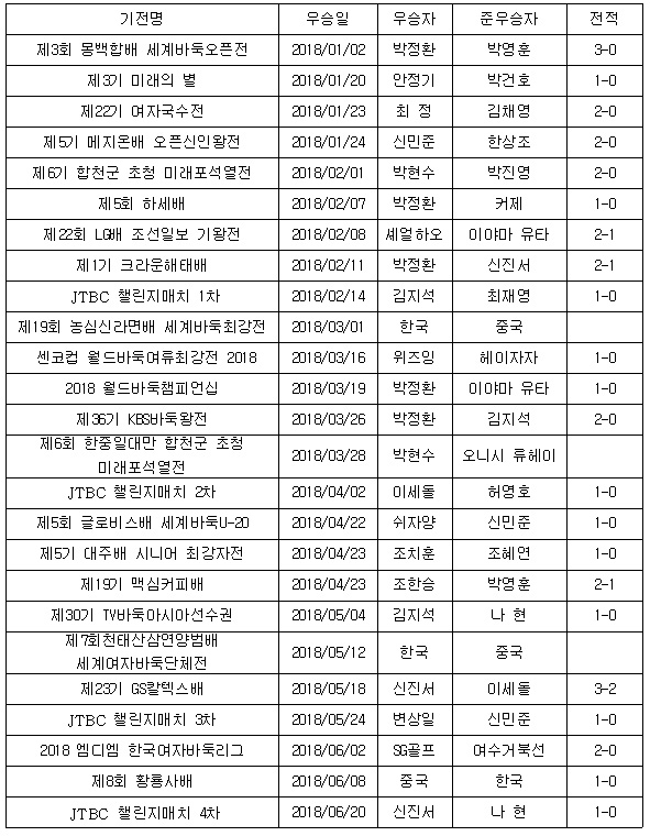 박정환 9단이 몽백합배와 하세배ㆍ월드바둑챔피언십에서 우승했고, 김지석 9단은 농심신라면배에서 5년 만에 한국에 우승컵을 선사한데 이어 TV바둑아시아선수권에서도 첫 우승컵을 거머쥐었다. 여자 단체전인 천태산배에서도 김채영 4단의 전승 활약으로 극적인 우승에 성공했다.
