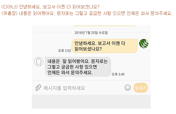 문자를 보시면 아시겠지만, 이것은 디아나 사범이 7월 25일에 유총장과 문자로 나눈 대화의 내용입니다. 디아나가 “보고서 이젠 다 읽어보셨나요?”라고 질문하자 유총장이 “내용은 잘 읽어봤다”고 답하고 있습니다. 만약 기원이 주장하는 바와 같이 유총장이 디아나와 이승현이 “보고서”라고 말하는 것을 읽어봤다면, 그것을 건네주었을 때, “아∼ 이거 내가 말한 그 요약본이네∼ 이거는 봤어” 했어야 하는 것이 정상이지요.
