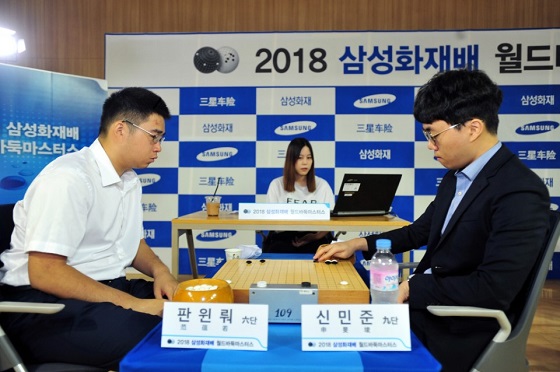 6일 경기도 고양시 삼성화재 글로벌캠퍼스에서 열린 2018 삼성화재배 월드바둑마스터스 본선 32강 최종일 경기에서 한국은 신민준 9단이 판윈뤄 6단에게 241수 만에 흑 불계승을 거두며 16강 진출에 성공했다.