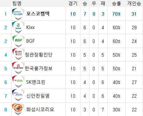 ■ 11라운드 2경기(금) 한국물가정보(5승 5패. 5위) VS 포스코켐텍(7승 3패. 1위)