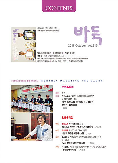이번 호 [커버스토리]에서는 박정환-최정 페어가 환상의 호흡으로 세계페어대회 우승트로피를 들어 올린 이야기를 담았다. 한국 남녀 랭킹 1위 박정환-최정 페어가 중국 남녀 랭킹 1위 커제-위즈잉 페어에게 승리한 역투보는 [상세관전기2]에서 최정 9단의 자전해설로 해부했다.