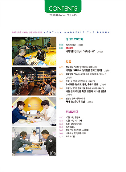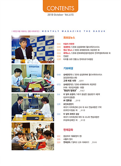 신설 코너 [이 달의 컷컷컷]에는 승부 현장 구석구석을 누빈 기자들이 선정한 가장 강렬한 컷을 담았다. 10월호에서는 불세출의 승부사 이세돌 9단의 상대를 압도하는 눈빛을 감상할 수 있다. 또 다른 신설 코너 [생생 현장]에는 2018 삼성화재배 월드바둑마스터스 열전의 순간들이 담겼다.