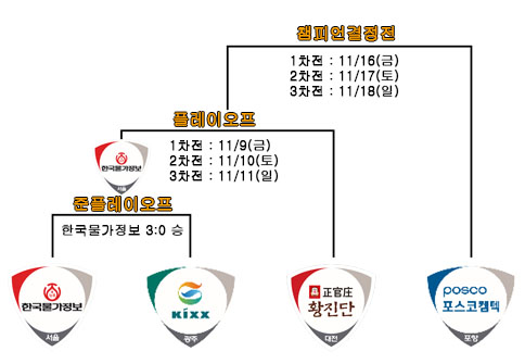 정규시즌 4위로 준플레이오프에 오른 한국물가정보는 정규시즌 2위 정관장황진단과 챔피언결정전 진출을 놓고 내달 9일부터 3연전을 치른다.