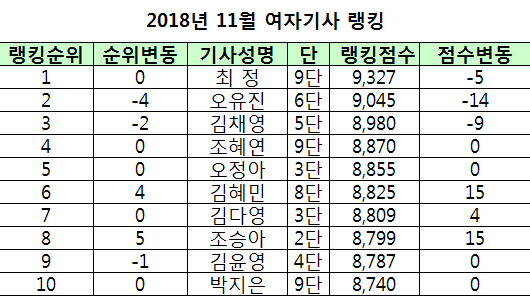 한편 랭킹 1위 최다 기록을 보유한 박정환 9단은 10월 한 달 동안 3승 3패로 27점을 잃고 9997점을 기록하며 1위 질주를 멈췄다.