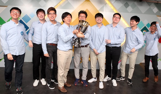 ▲포스코켐텍 선수단이 2018 KB국민은행 바둑리그 우승을 결정지은 후 자축하고 있다.양국 리그의 우승팀답게 화려한 라인업을 자랑하는 두 팀은 막상막하의 대결을 펼칠 것으로 예상된다.