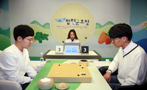 ▲반대편 준결승에서 윤민중 2단을 물리치고 결승에 합류한 문민종 초단(오른쪽)프로무대 첫 우승에 도전하는 두 기사는 2017 크라운해태배 남자조 예선 5회전에서 한번 공식 대국을 벌여 강우혁 2단이 승리한 바 있다.