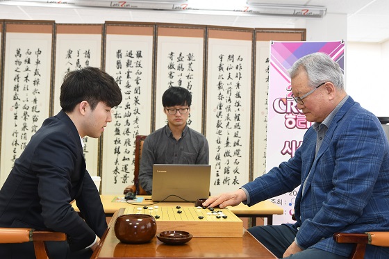 ▲기념대국을 펼치고 있는 윤영달 크라운해태 회장(오른쪽)과 박하민 5단박하민 5단은 2월 9일 벌어진 결승1국에서 나현 9단에게 선취점을 얻는데 이어 2월 10일 열린 2국에서 불리했던 바둑을 역전하며 종합전적 2-0으로 크라운해배태 챔프에 올랐다.