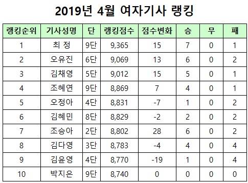 여자 기사 중에는 최정 9단이 3계단 오른 30위에, 오유진 6단이 8계단 상승한 89위에 랭크됐다.