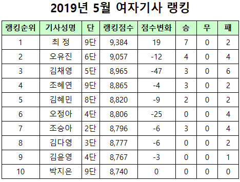 2019년 5월 프로기사 랭킹 보기 (클릭)