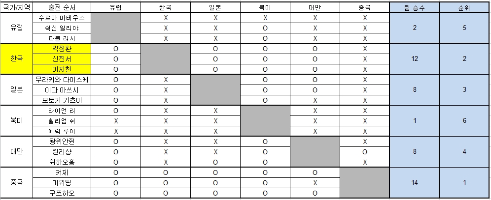 한편 같은 방식으로 진행된 남자 단체전에서 박정환·신진서·이지현 9단으로 구성된 한국은 14일 오전 1라운드에서 유럽에게 3-0 완승을 거두며 기분 좋은 출발을 했지만 오후에 열린 2라운드에서 중국에게 0-3으로 패했다. 이어 15일 3·4라운드에서 대만과 일본을 3-0으로 꺾고 16일 5라운드에서 북미마저 3-0으로 제압하며 4승 1패를 기록해 5전 전승을 달성한 중국에 밀려 준우승을 차지했다.