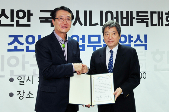 ▲ 지난해 12월 열린 ‘1004섬 신안 국제시니어바둑대회’ 조인식 및 업무협약식에서 박우량 신안 군수(왼쪽)와 한상열 한국기원 부총재가 함께 자리했다일요일인 9일 오전 10시부터는 군민바둑대회와 어울림한마당 행사도 함께 열릴 예정이다.