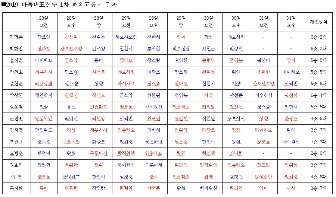 한 사람당 하루 2∼3판씩 대국하는 일정으로 총 10라운드가 펼쳐진 이번 해외교류전에서 한국 국가대표팀은 28일 21승 21패 무승부, 29일 21승 21패 무승부, 30일 14승 14패 무승부, 31일 8승 14패로 패해, 종합전적 64승 70패를 기록했다.