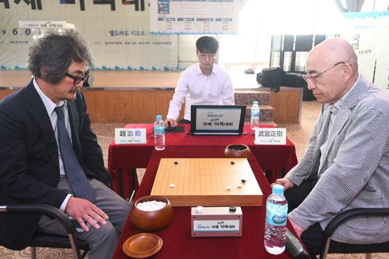 ▲조치훈 9단(왼쪽)이 다케미야 마사키 9단에게 스무개가 넘는 대마를 잡히며 불계패했다개인전 8강전은 9일 오후 1시 30분부터 같은 장소에서 열린다.